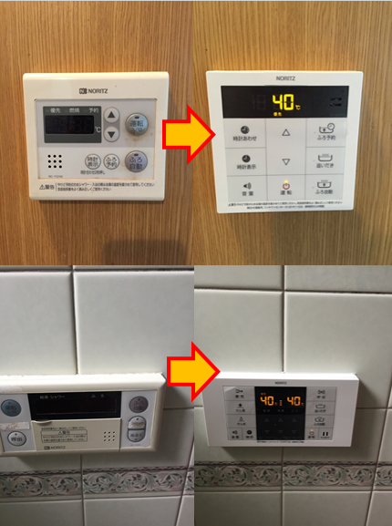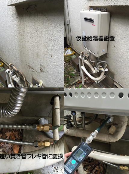 | 備考 | 「給湯器から水漏れして動きません」とのSOSで仮設給湯器を設置、お客様のご要望でノーリツ20号オートからノーリツ24号オートへの交換となりました。追い焚き銅管をフレキ管に変換、3/4給湯給水管を新規交換し無事完了です。 | |