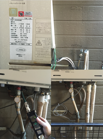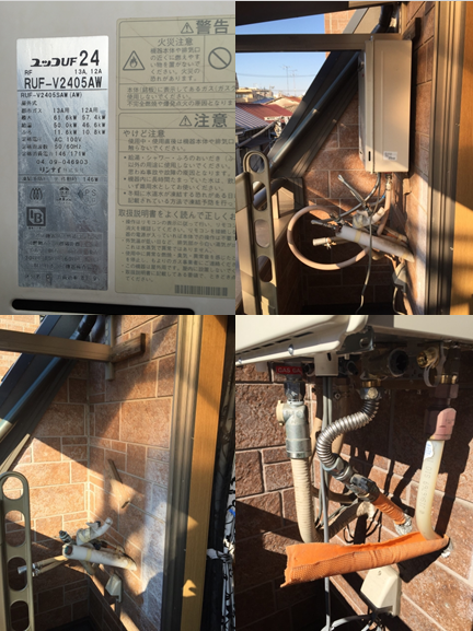 | 備考 | 「給湯器が壊れて困っています。」とのSOSで即日仮設給湯器を設置し、本日既存リンナイRUF-V2405AW(24号フルオート)からリンナイ24号フルオートRUF-A2405AWへの交換となりました。給湯給水管を保温後、配管カバーROP-6101(K)-OPも取付無事完了です。 | |