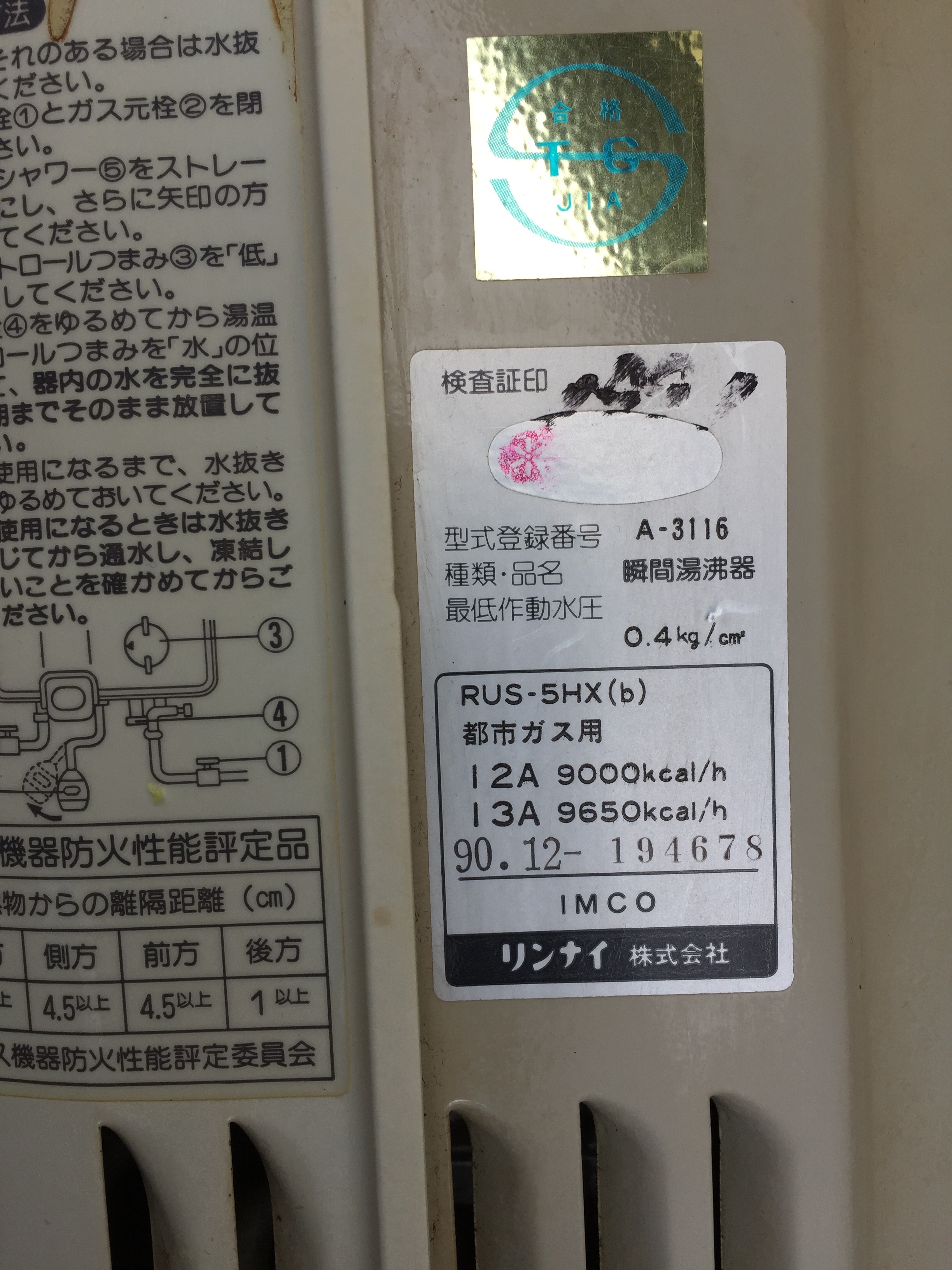 | ガス給湯器種類 | リンナイ RUS-5HX(b) |