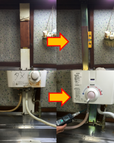 | 備考 | 「瞬間湯沸かし器が壊れた」のSOSで本日GQ-520MW/13A(弊社在庫品)に交換となりました。既存の取付板がかなり古かったので取付寸法を590~1060mmの間で伸縮できる湯沸器取付板(カンタン)に交換し無事完了です。 | |