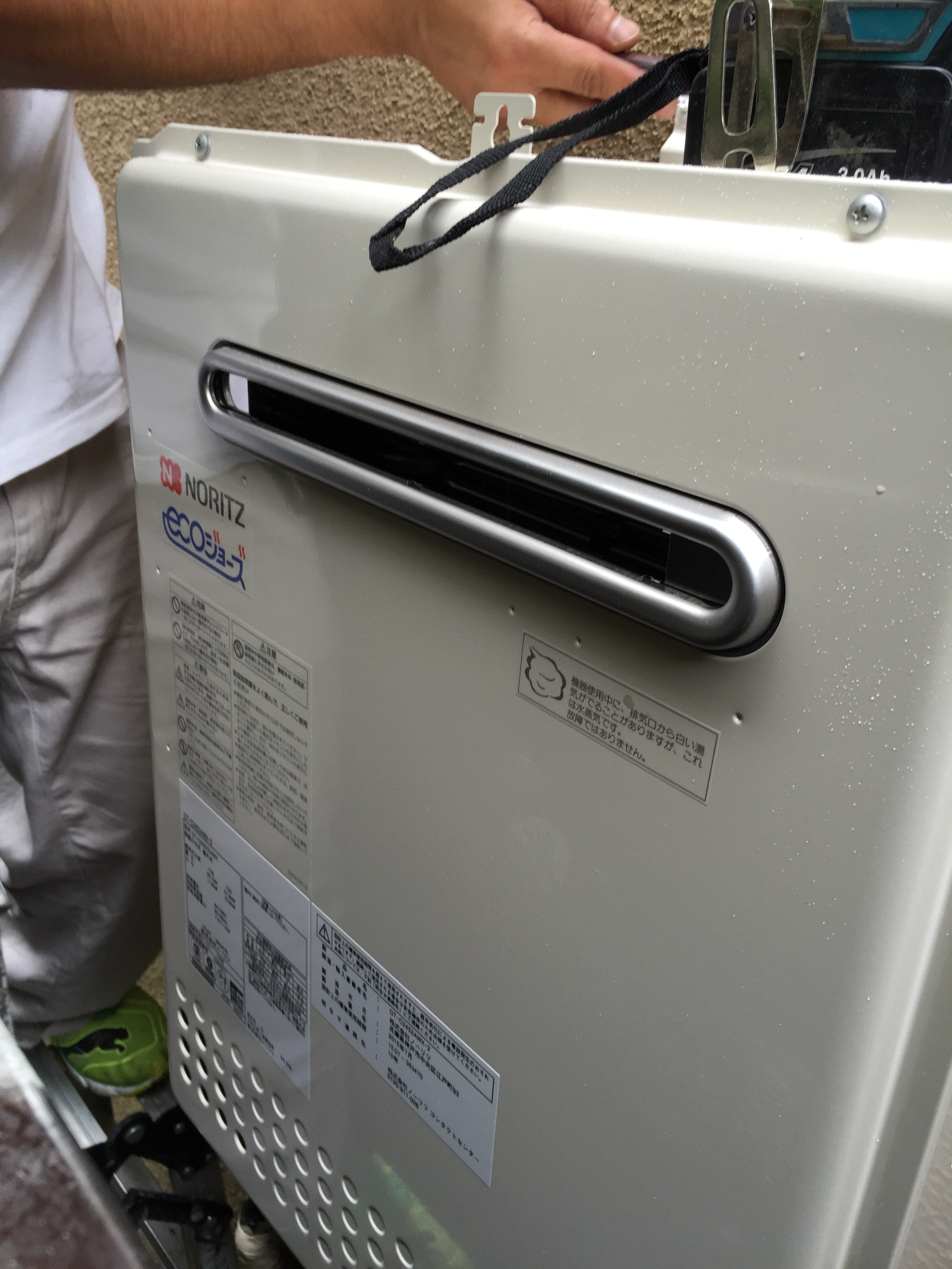 | 備考 | お客様から「お湯が出ない」とのSOSで仮説給湯器設置後ノーリツフルオート24号GT-2422AWXからエコジョーズGT-C2452AWX-2 BLに本日の施工となりました。ドレン配管の距離が2,000mmあったのと設置場所がせまかったので少々手こずりましたが無事完成です。 | |