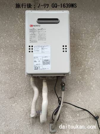 | 備考 | 「給湯器の調子が悪い」とのお電話で本日ノーリツ16号給湯専用GQ-166WSから後継機種GQ-1639WSへの交換となりました。PS内設置の為PS枠PK-D350NR を使用し漏ガスチェック後無事完了です。 | |